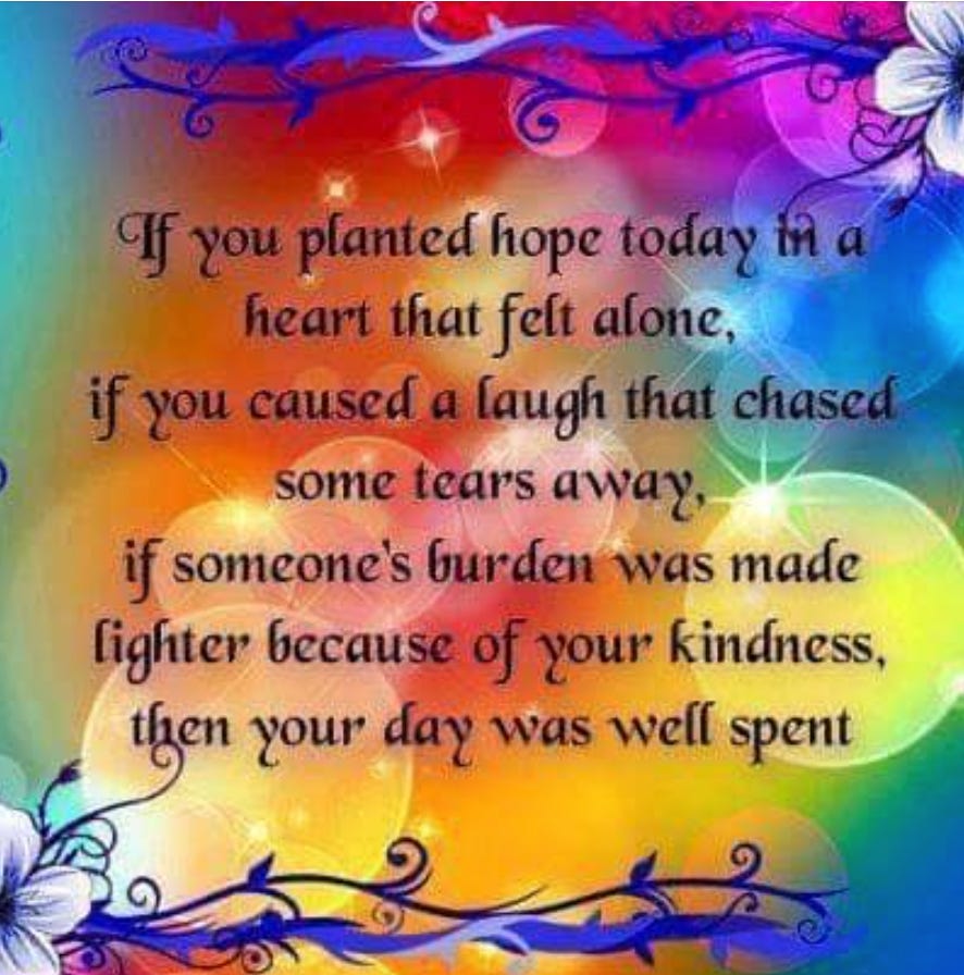 My support comes from my subscribers and I really appreciate it. If you enjoy what the Kindness Boomerang newsletter provides, please feel free to share this link on your social media. Subscriptions can be either free or paid. It’s a simple process of sharing your email address. Thanks for your support!
